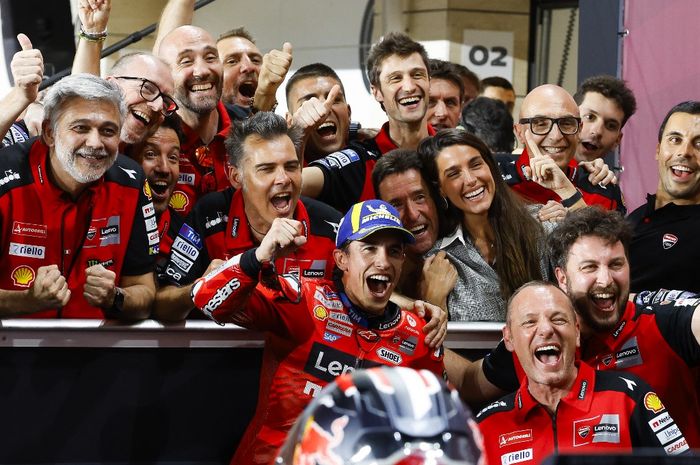 Pembalap Ducati, Marc Marquez, dan tim merayakan kemenangan MotoGP Qatar 2025 di Sirkuit Lusail, Minggu (13/4/2025). (KARIM JAAFAR/AFP)