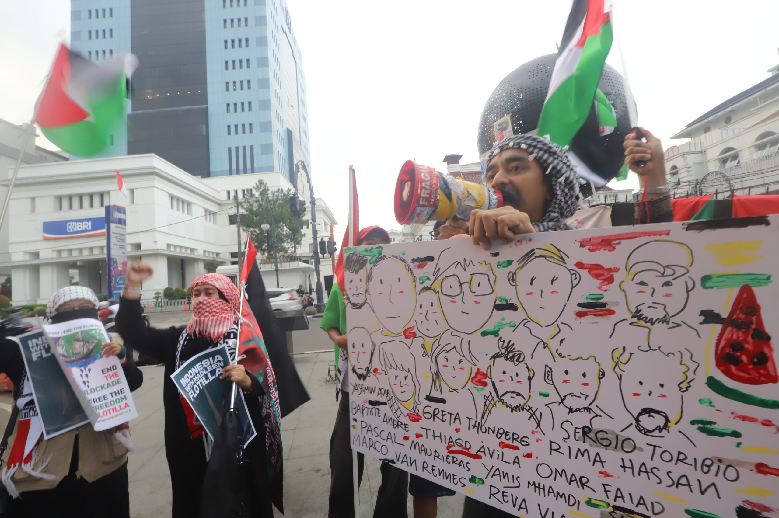 Dalam aksinya, massa menuntut pembebasan 12 aktivis kemanusiaan Freedom Flotilla’s Madleen yang ditangkap oleh pasukan keamanan Israel.