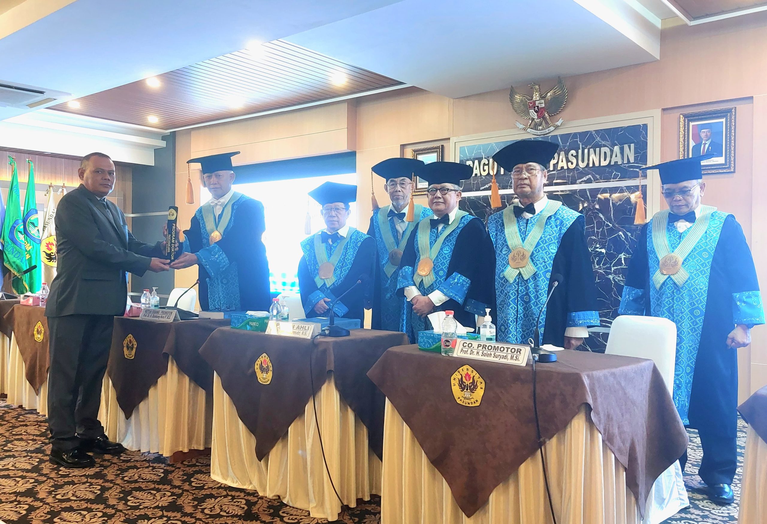 Sidang promosi tersebut dipimpin oleh Prof. Dr. H. Bambang Heru P., M.S. yang juga bertindak sebagai promotor. Ia didampingi oleh promotor pendamping Prof. Dr. H. Thomas Bustomi, M.Si., dan co-promotor Prof. Dr. H. Soleh Suryadi,