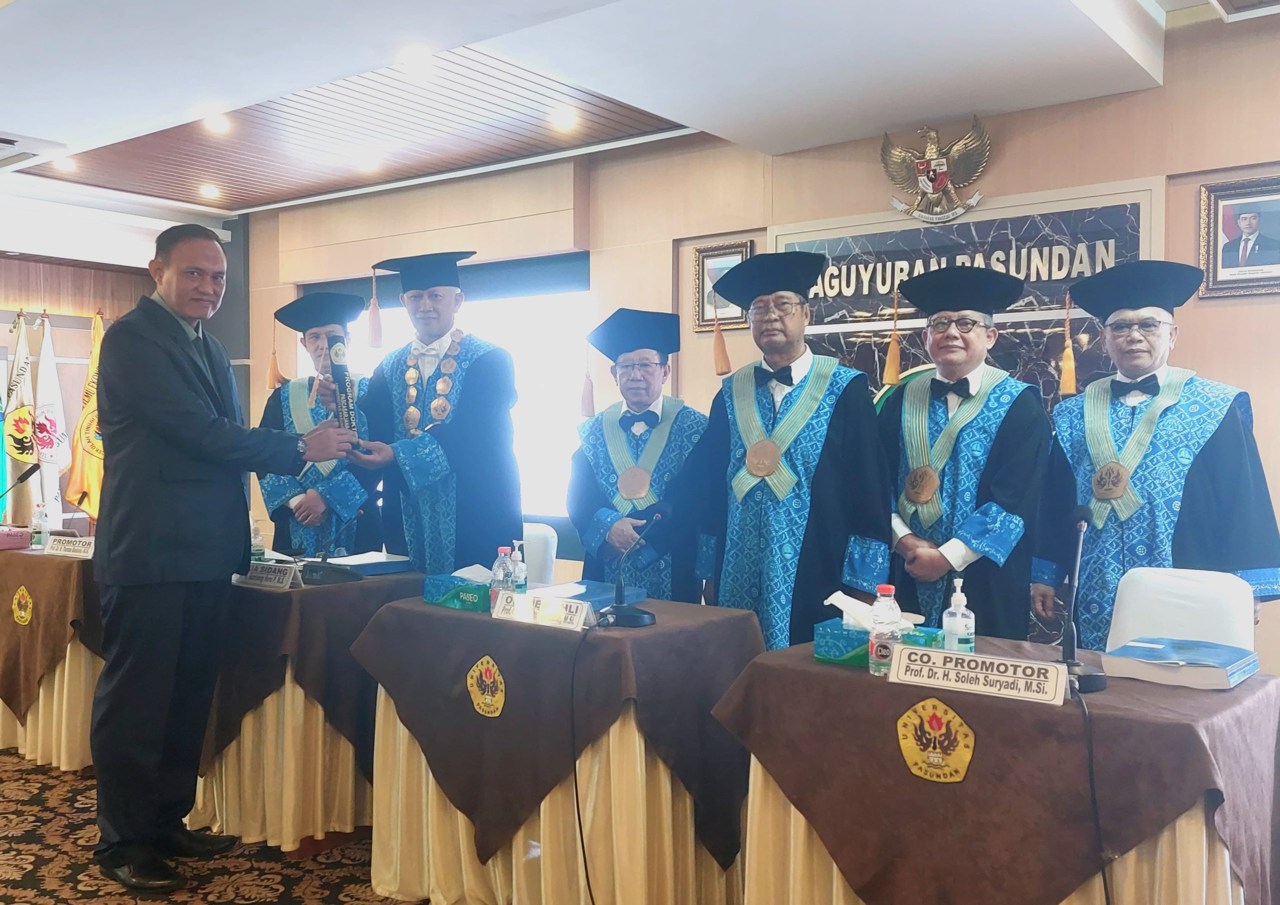 Sidang dipimpin oleh Prof. Dr. H. Bambang Heru P., M.S. selaku Ketua Sidang Promosi, dengan promotor Prof. Dr. H. Thomas Bustomi, M.Si., serta co-promotor Prof. Dr. H. Soleh Suryadi, M.Si.