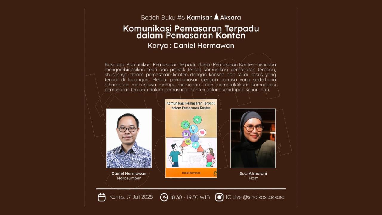 Sindikasi Aksara mengajak seluruh pegiat literasi, mahasiswa, content creator, serta siapa pun yang tertarik pada dunia komunikasi dan pemasaran digital untuk bergabung dalam sesi ini. Siapkan pertanyaan, buka wawasan, dan temukan inspirasi baru di KamSara #6. (tiwi)