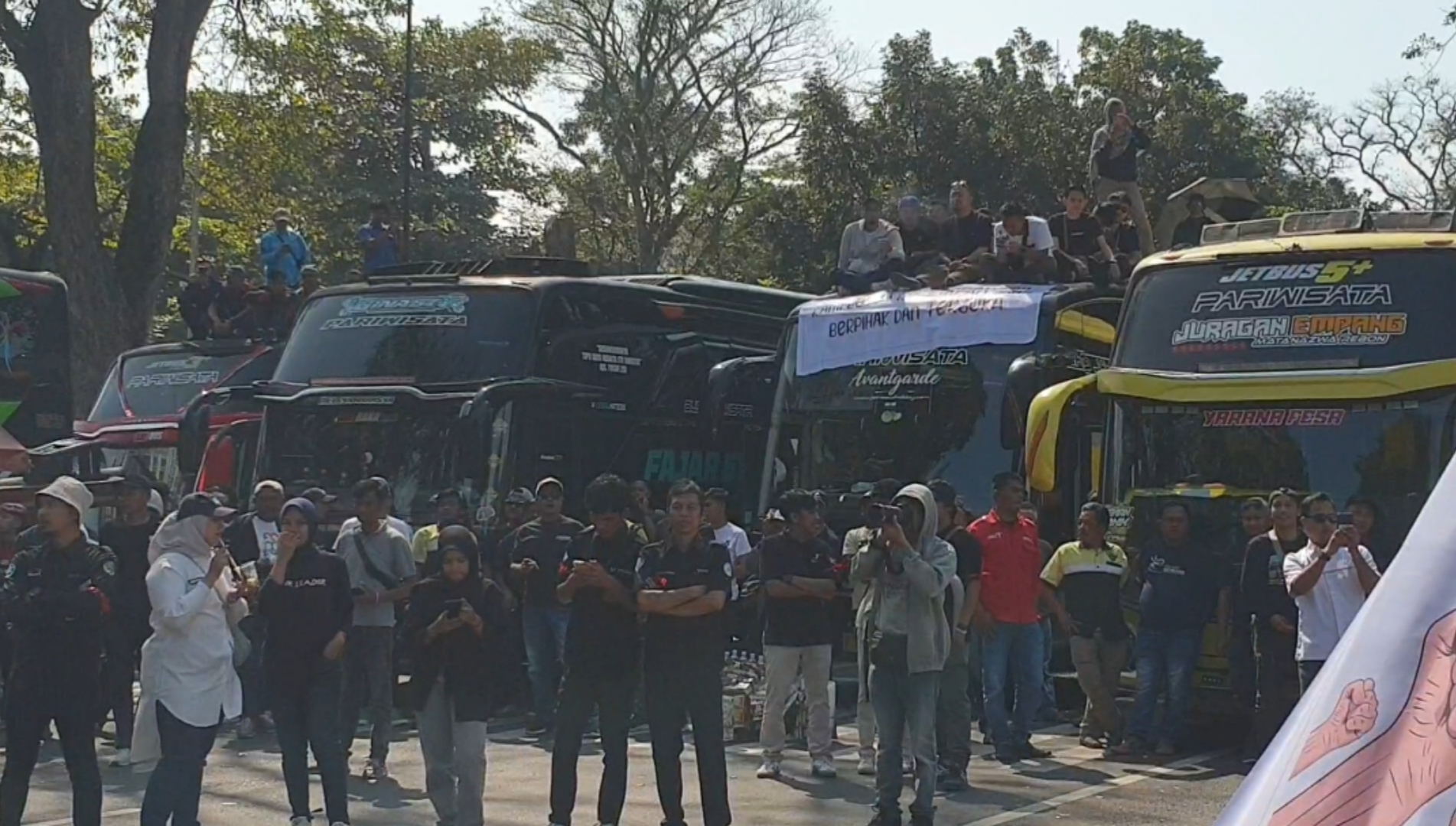 Selain berorasi, massa juga memarkirkan ratusan bus pariwisata secara berjajar di sepanjang Jalan Diponegoro, sehingga sempat memblokade akses lalu lintas.