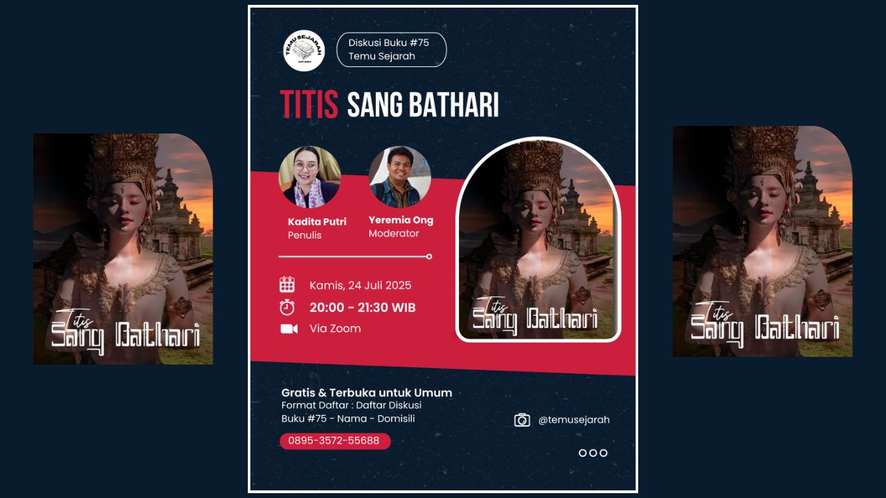 Diskusi mengenai novel ini akan dikupas tuntas dalam Diskusi Buku #75 Temu Sejarah, yang akan berlangsung secara daring melalui Zoom pada Kamis, 24 Juli 2025, pukul 20.00–21.30 WIB. Acara ini akan menghadirkan langsung Kadita Putri sebagai narasumber, dan dipandu oleh Yeremia Ong sebagai moderator.