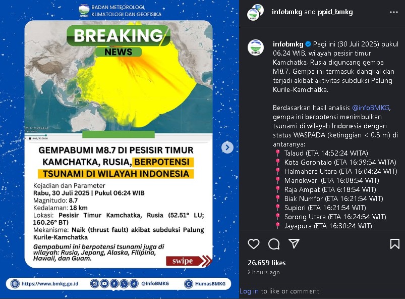 WWW.PASJABAR.COM – Gempa bumi berkekuatan magnitudo 8,7 mengguncang wilayah pesisir timur Kamchatka, Rusia, Rabu (30/7/2025) pukul 06.24 WIB. Gempa dangkal ini dipicu aktivitas subduksi di Palung Kurile-Kamchatka.
