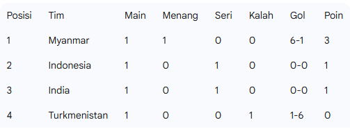 Hasil imbang ini membuat Indonesia dan India berbagi poin dan menempati posisi kedua dan ketiga di Grup D, tertinggal dua poin dari Myanmar yang berada di posisi teratas setelah menang 6-1 atas Turkmenistan.