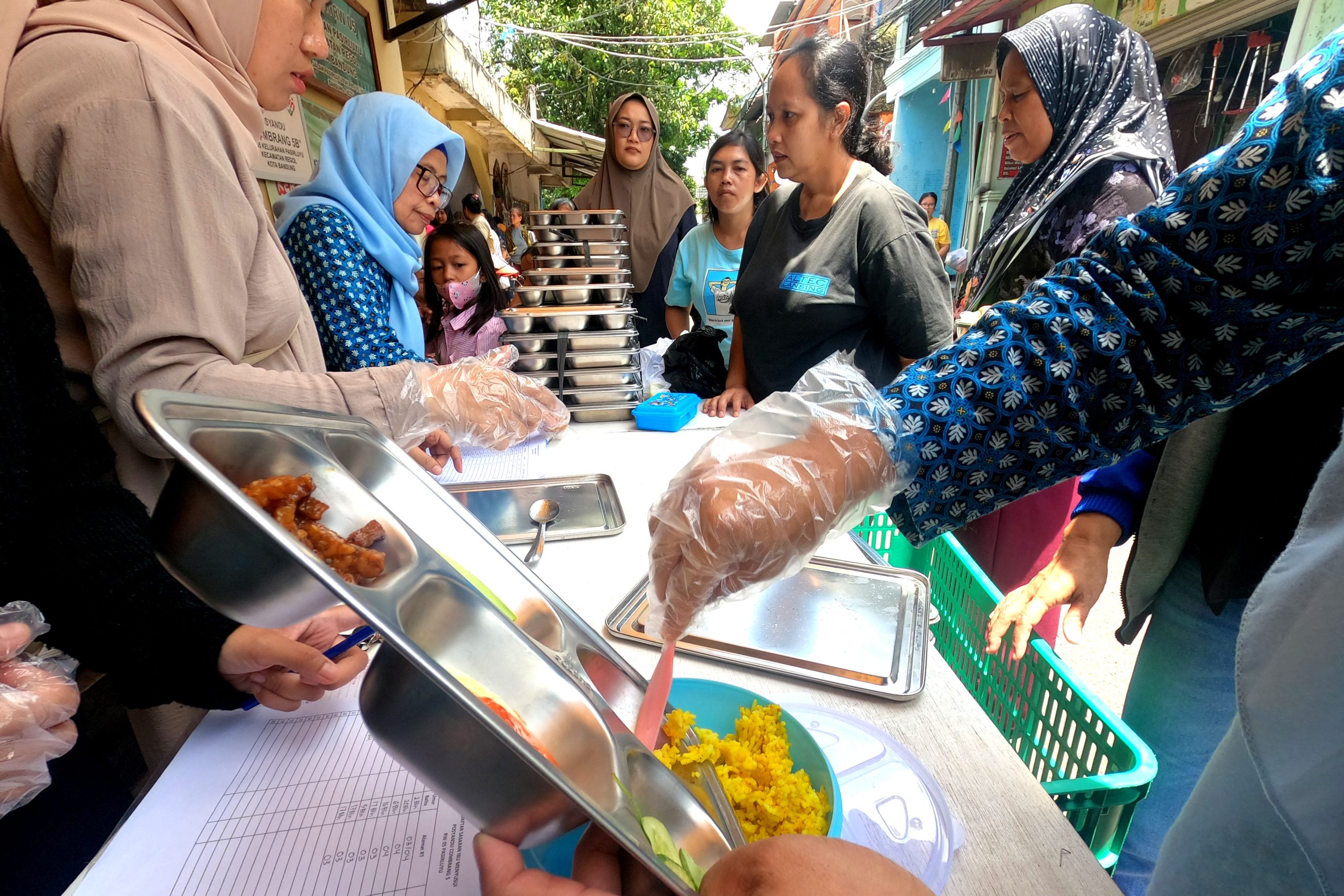 Dalam pelaksanaannya, penerima manfaat membawa tempat makan dari rumah masing-masing untuk kemudian diisi dengan makanan bergizi yang disiapkan.
