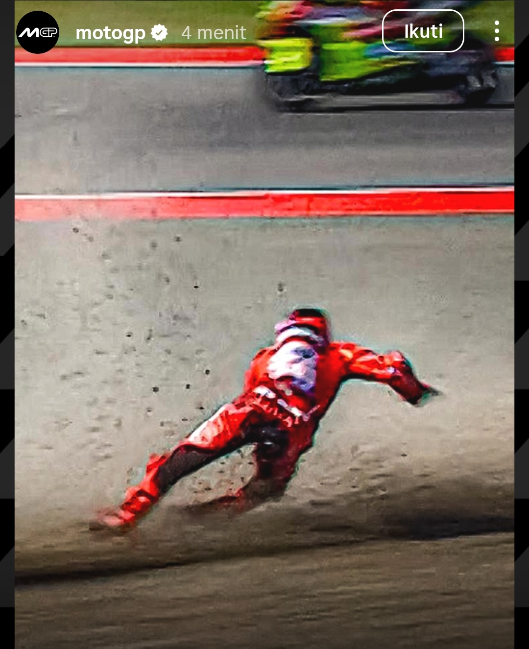 Selain, kegagalan Marc Marquez, kutukan juga menyelimuti tim Ducati Lenovo, pembalap kedua mereka Francesco Baqnaia terjatuh pada lap ke-9.