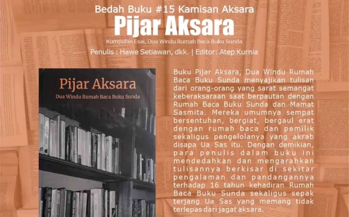 BANDUNG, WWW.PASJABAR.COM— Kamisan Aksara kembali hadir dengan edisi ke-15 yang akan membedah buku Pijar Aksara: Dua Windu Rumah Baca Buku Sunda, karya Hawe Setiawan dan kawan-kawan, disunting oleh Atep Kurnia. Acara ini akan berlangsung pada Kamis, 9 Oktober 2025 pukul 19.30–20.30 WIB melalui Instagram Live @sindikasi.aksara.