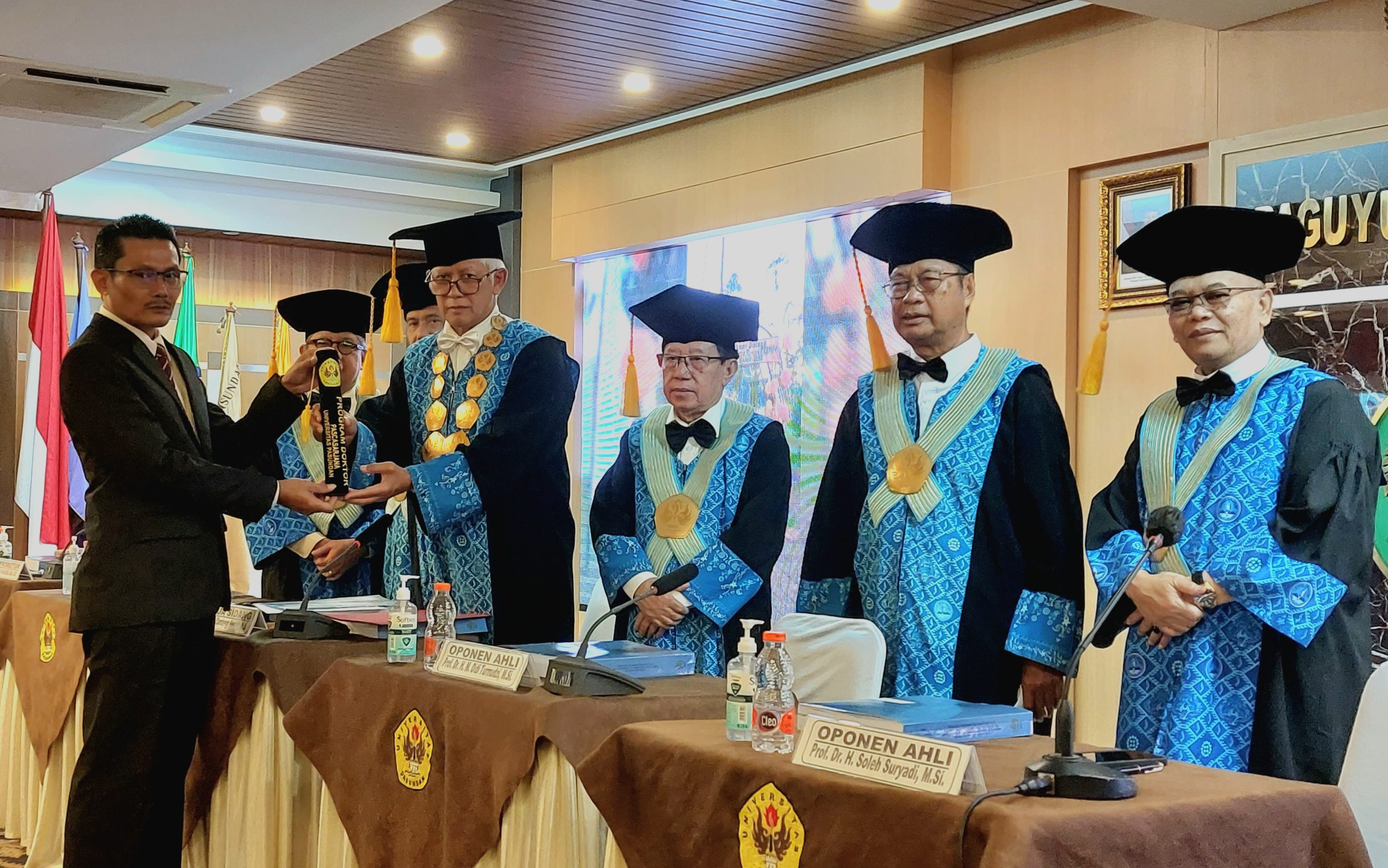 Sidang dipimpin oleh Ketua Sidang Promosi Prof. Dr. H. Bambang Heru P, MS., dengan Promotor Prof. Dr. Iwan Satibi, S.Sos., M.Si., serta Co-Promotor Prof. Dr. H. Thomas Bustomi, M.Si.