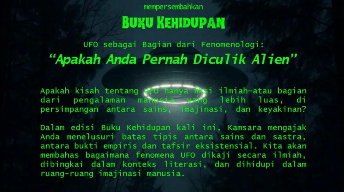 Melalui segmen “Buku Kehidupan”, diskusi kali ini mengangkat tajuk “UFO sebagai Bagian dari Fenomenologi: Apakah Anda Pernah Diculik Alien?”