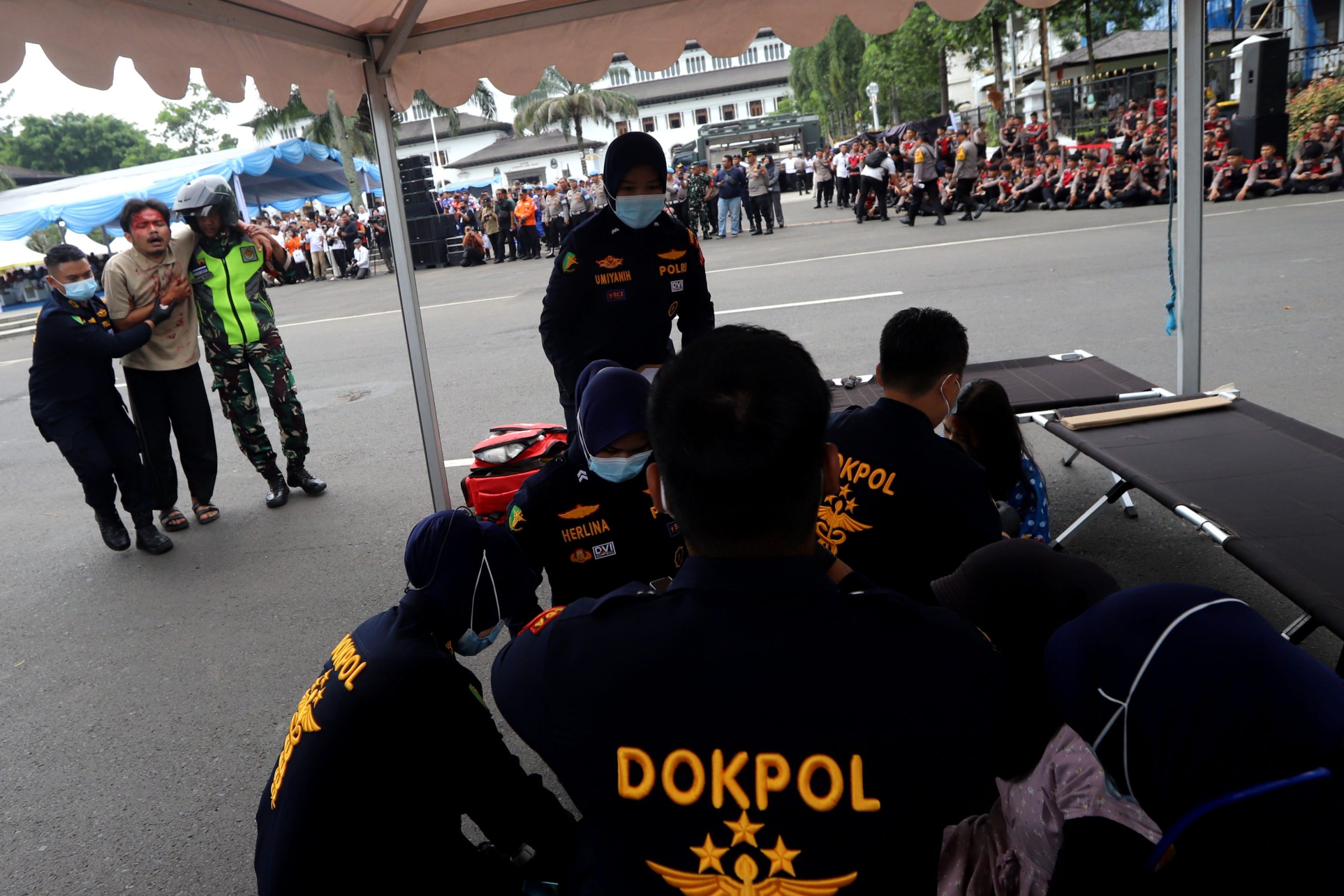 Petugas gabungan dari Polri, TNI, BPBD, dan relawan melaksanakan simulasi Siaga Tanggap Bencana Polda Jawa Barat 2025, Rabu (5/11/2025). (foto: eci/pasjabar)