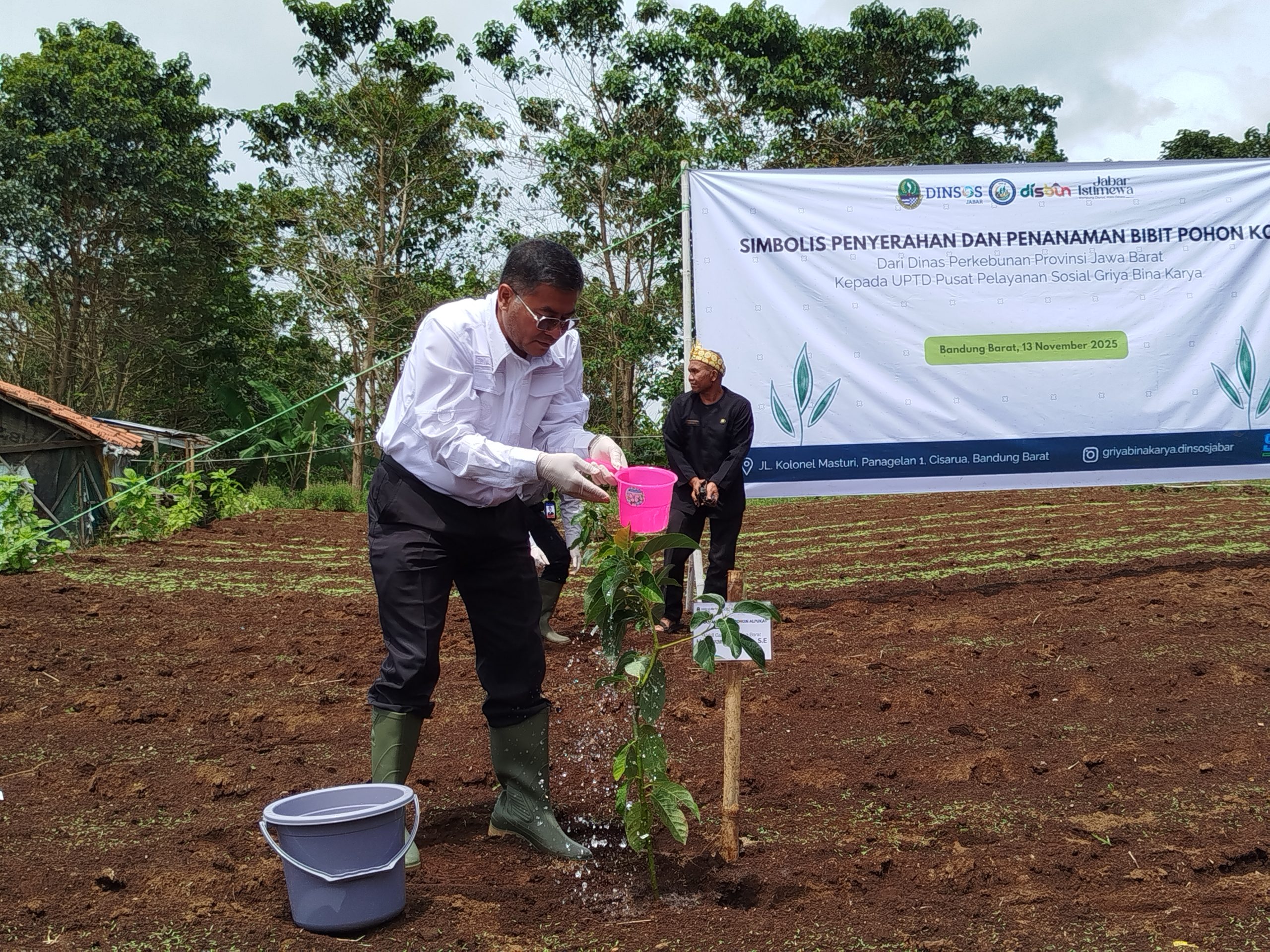 LEMBANG, WWW.PASJABAR.COM — Wakil Gubernur Jawa Barat, H. Erwan Setiawan, didampingi Kepala UPTD Pusat Pelayanan Sosial Griya Bina Karya (PPSGBK) Dinas Sosial Jabar, Yudi Purwana, melakukan penanaman pohon kopi dan alpukat secara simbolis di area lahan PPSGBK Lembang, Kabupaten Bandung Barat, Kamis (13/11/2025).