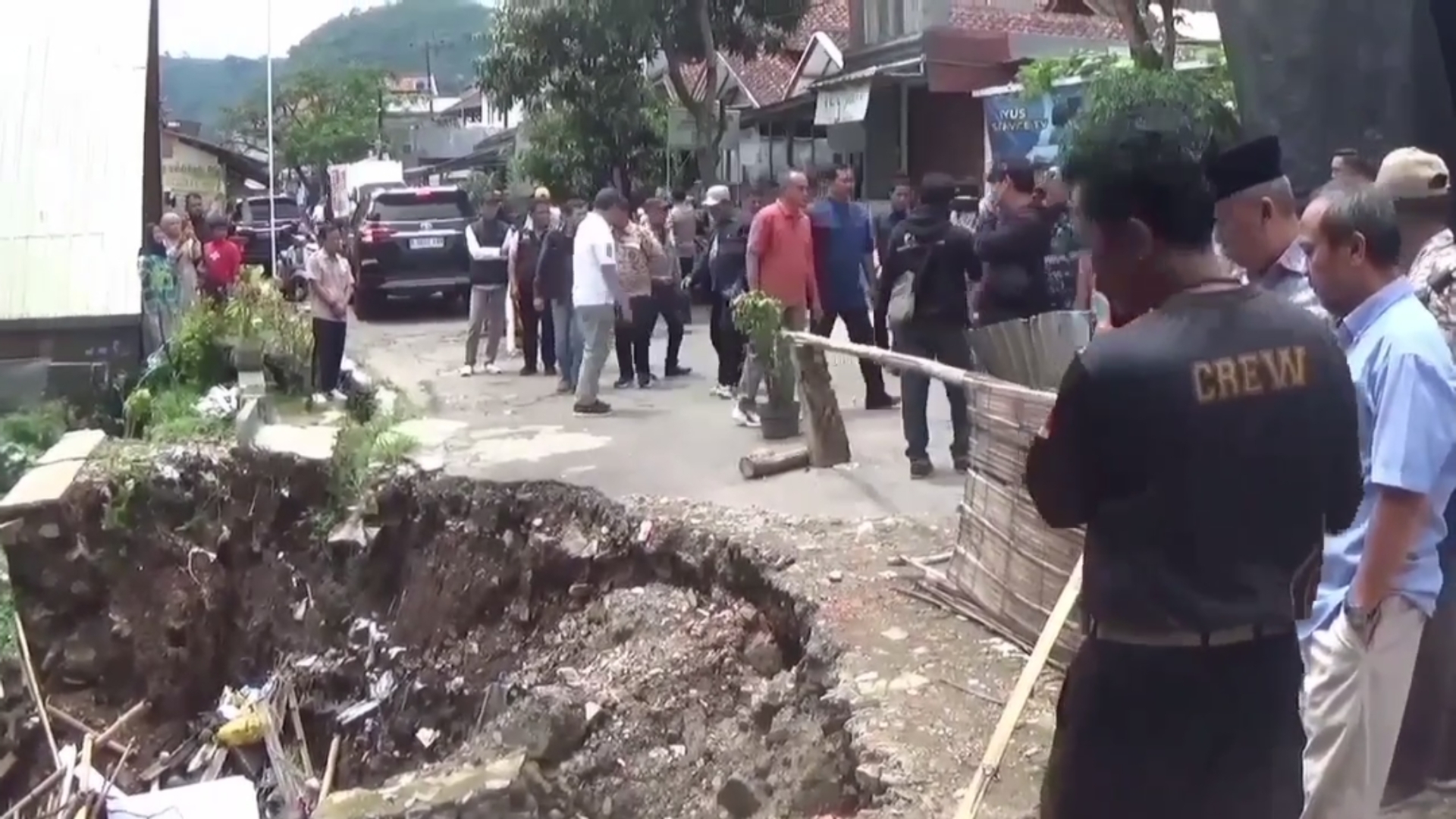 Hujan deras yang mengguyur Bandung Barat mengakibatkan jalan di Desa Cililin, amblas dan mengalami kerusakan parah pada Senin (17/11/2025) pagi. (foto: uby/pasjabar)