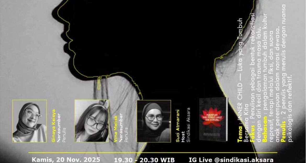 Acara akan digelar Kamis, 20 November 2025 pukul 19.30–20.30 WIB melalui IG Live @sindikasi.aksara dengan mengangkat tema “INNER CHILD – Luka yang Tumbuh Bersama Kita.”