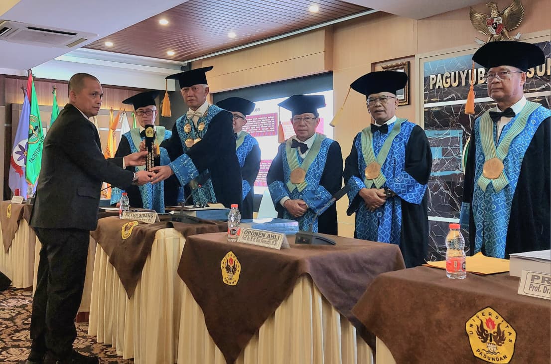Sidang dipimpin oleh Prof. Dr. H. Bambang Heru P, MS., dengan Promotor Prof. Dr. H. Kamal Alamsyah, M.Si., serta Co-Promotor Prof. Dr. H. Thomas Bustomi, M.Si.