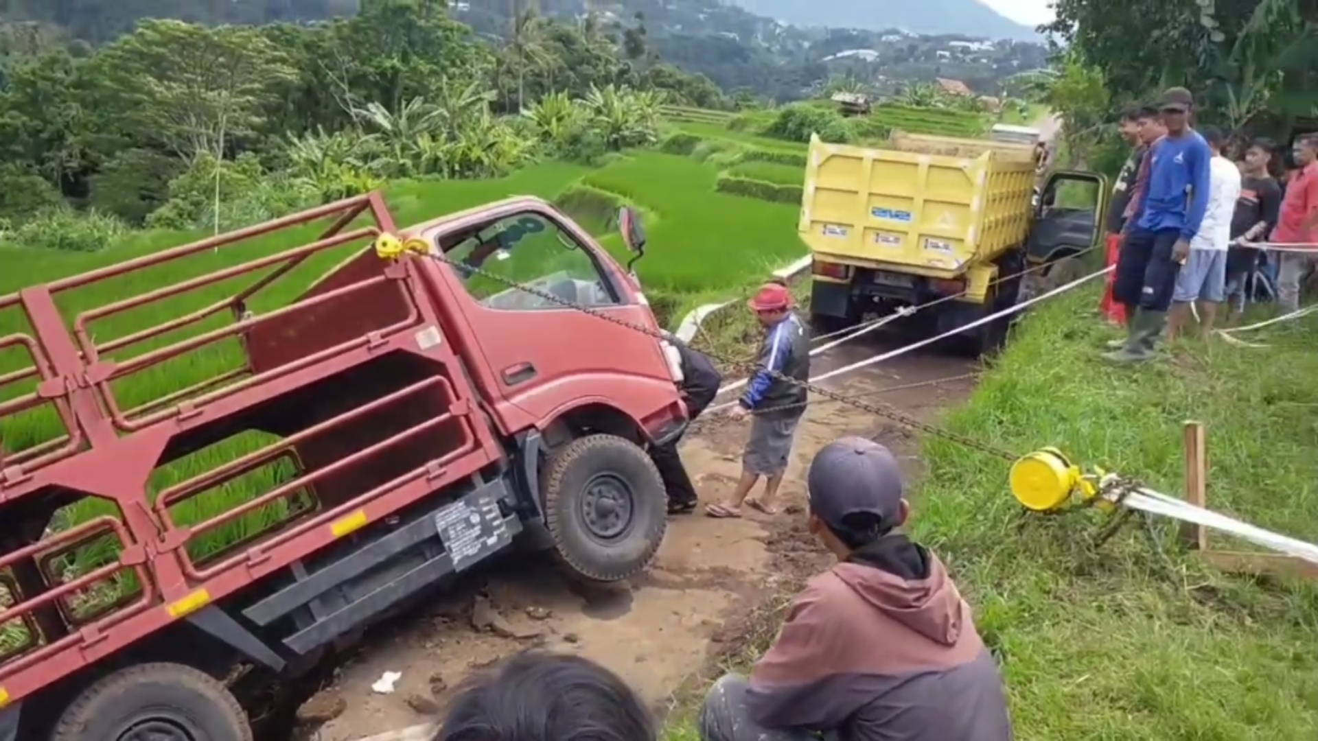 Meski tidak menimbulkan korban jiwa, kecelakaan tersebut sempat menyita perhatian warga dan menghambat aktivitas di sekitar lokasi. Proses evakuasi diperkirakan akan dilanjutkan dengan bantuan alat berat agar truk dapat segera dipindahkan dan jalur desa kembali normal. (uby)