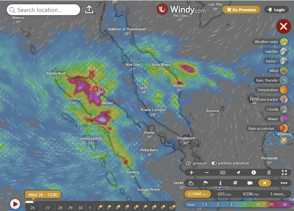 Siklon Tropis Senyar yang muncul pada akhir November 2025 menimbulkan dampak luas di wilayah Indonesia, Malaysia, dan Thailand. (foto: windy.com)