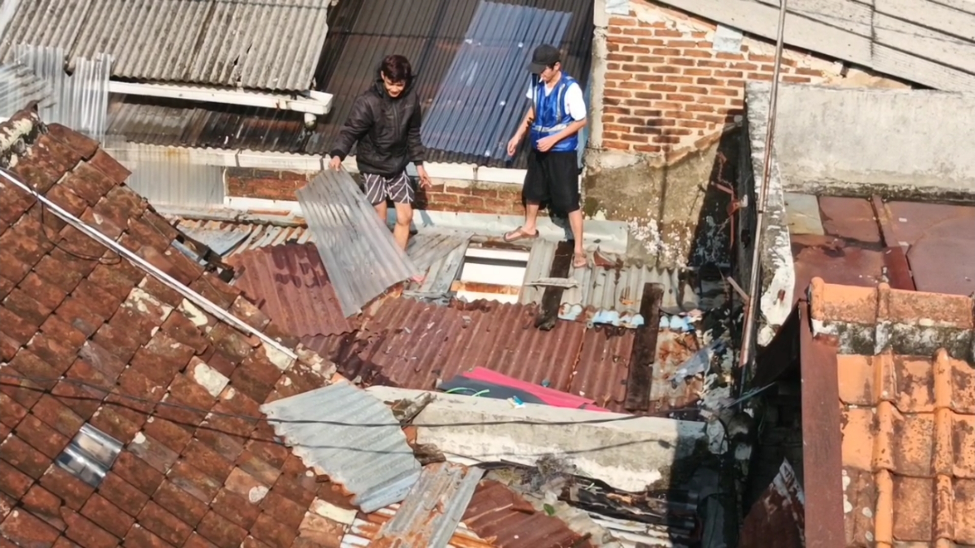 Beberapa atap rumah tampak terangkat, sementara serpihan kayu, genteng, serta sampah beterbangan hingga memenuhi jalan gang.