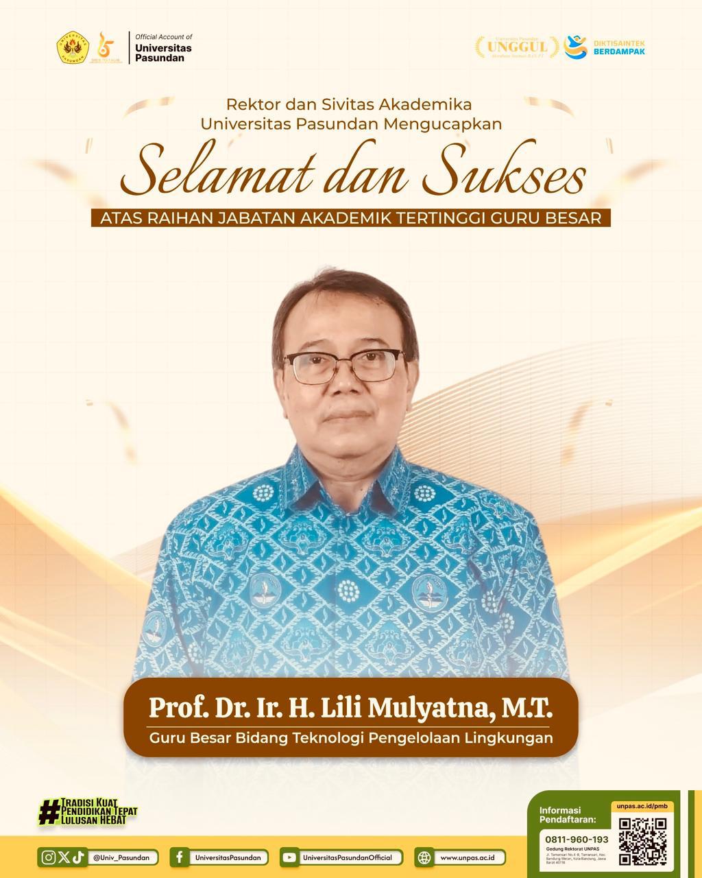 BANDUNG, WWW.PASJABAR.COM – Universitas Pasundan (Unpas) kembali menambah deretan akademisi berprestasi setelah Prof. Dr. Ir. H. Lili Mulyatna, MT., Dosen Tetap Fakultas Teknik sekaligus Pengurus Departemen Lingkungan Hidup PB Paguyuban Pasundan, resmi memperoleh jabatan Guru Besar Unpas dalam Bidang Teknik Pengelolaan Lingkungan.