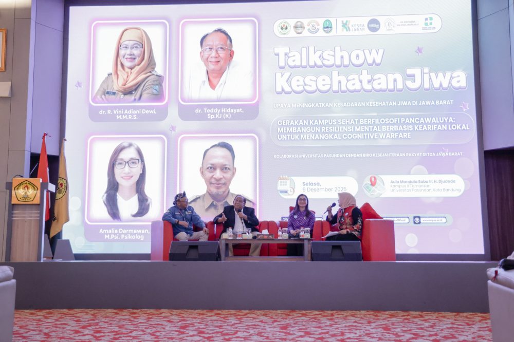 BANDUNG, WWW.PASJABAR.COM – Unit Pelayanan Kesehatan (UPK) Universitas Pasundan (Unpas) bekerja sama dengan Dinas Kesehatan Provinsi Jawa Barat Bidang Kesejahteraan Rakyat menggelar Screening Kesehatan Jiwa Online dan Talkshow di Aula Mandala Saba Ir. H. Djuanda, Kampus II Unpas Tamansari, Selasa (9/12/2025).