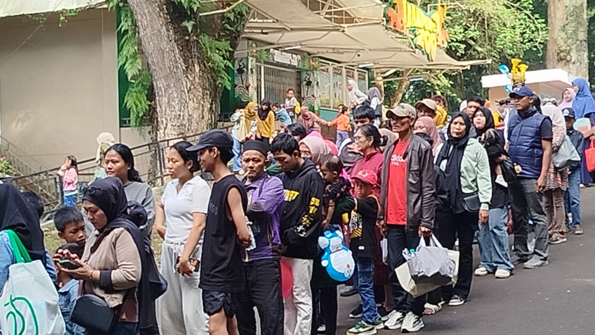 Sejak pagi hari, antrean panjang terlihat di pintu masuk Bandung Zoo. Para pengunjung datang bersama keluarga dan anak-anak untuk mengisi waktu liburan tanpa harus mengeluarkan biaya tiket masuk.
