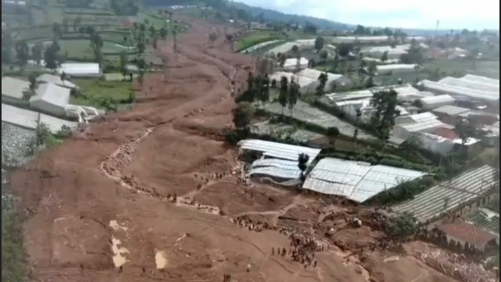 Dari pantauan udara, longsoran besar yang berasal dari hulu bukit di bawah kaki Gunung Burangrang tampak memanjang hingga sekitar tiga kilometer. Bencana tersebut berdampak pada area seluas kurang lebih 30 hektare dan menyebabkan sekitar 30 rumah warga rusak berat hingga luluh lantak.