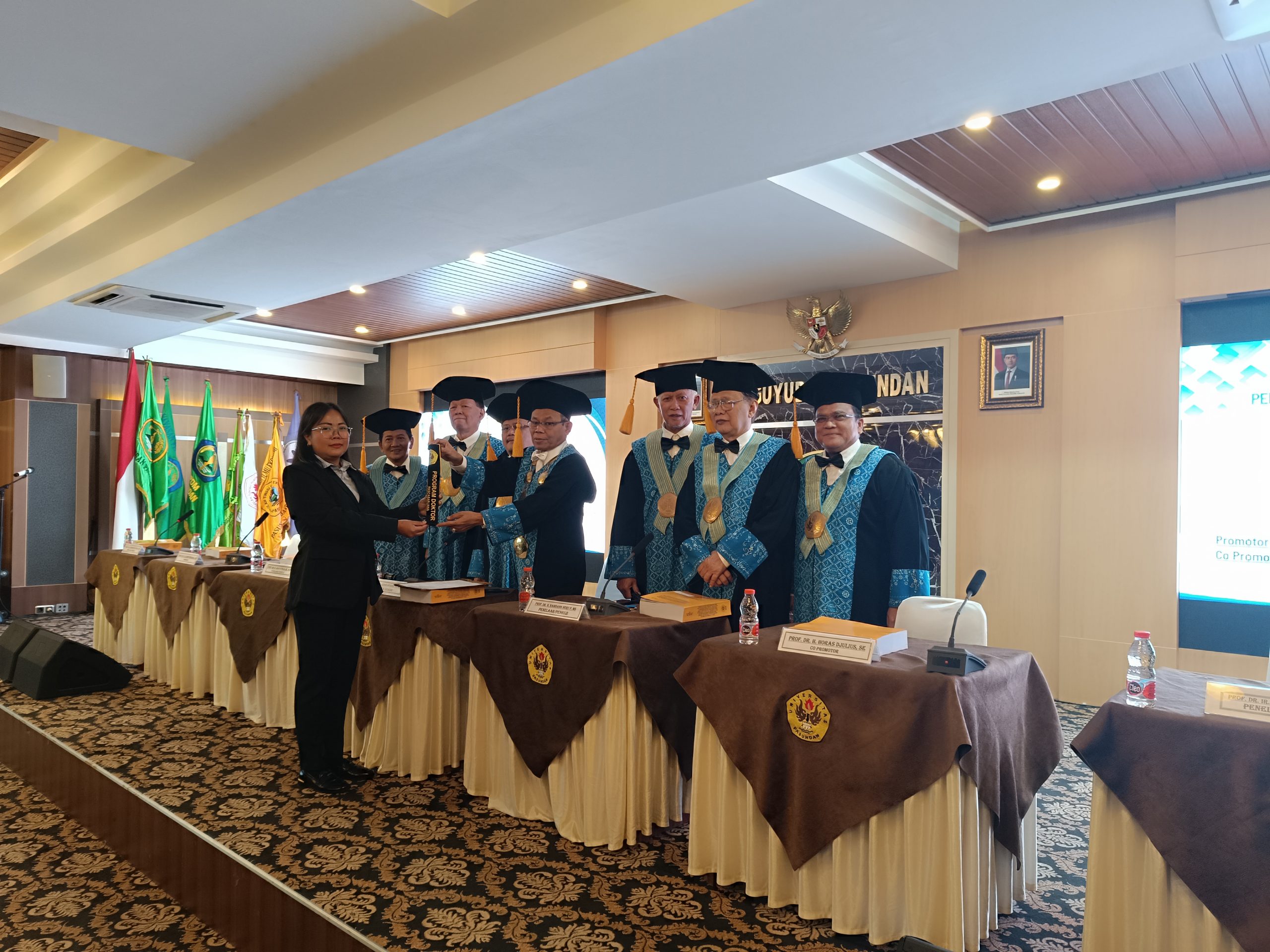 Sidang diketuai oleh Rektor Unpas, yakni Prof. Dr. H. Azhar Affandi, S.E., M.Si., dengan promotor Prof. Dr. H. M. Sidik Priadana, M.Si., dan ko-promotor Prof. Dr. H. Horas Djulius, S.E.