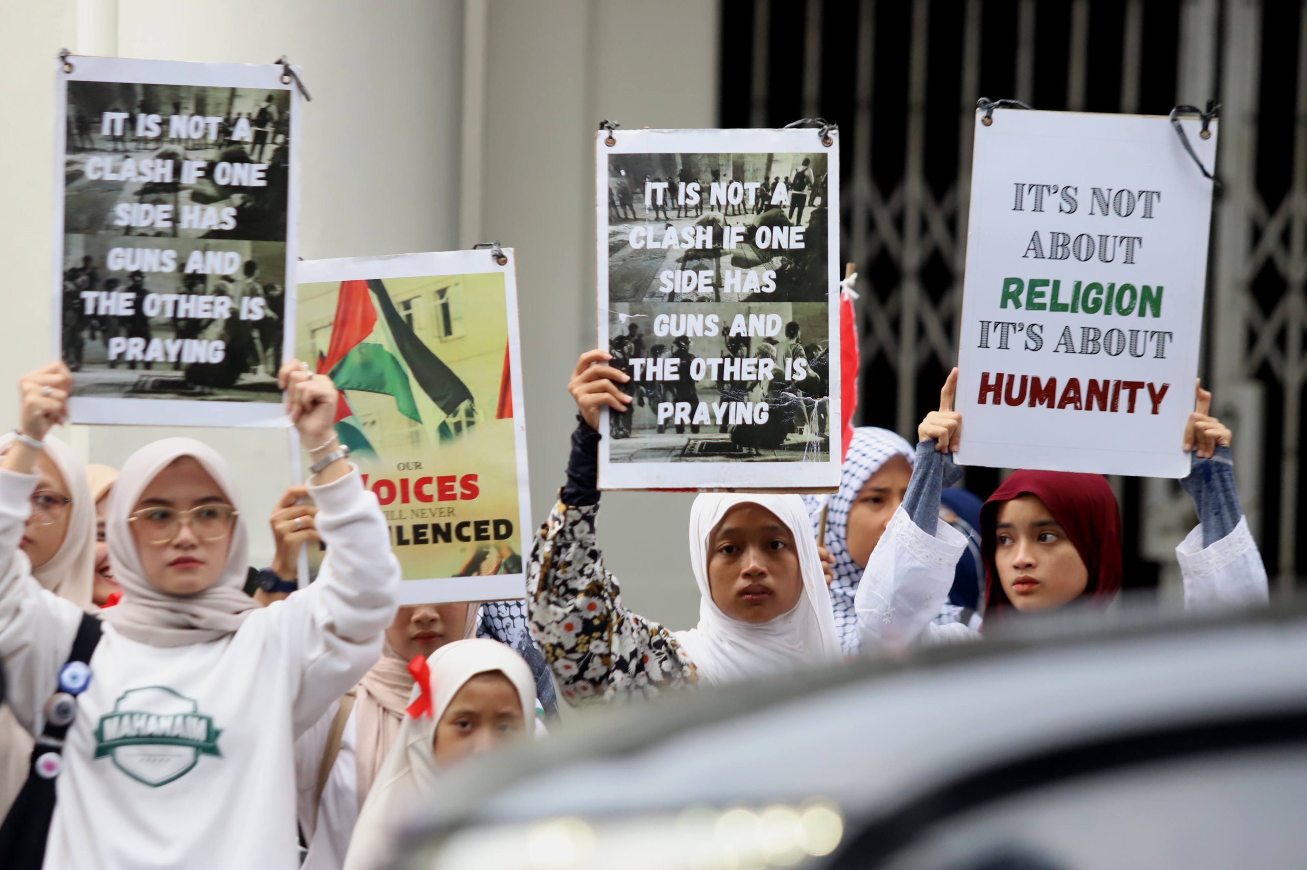 Massa yang datang dari berbagai kalangan membawa atribut bernuansa Palestina, seperti bendera, syal, dan poster berisi pesan solidaritas.