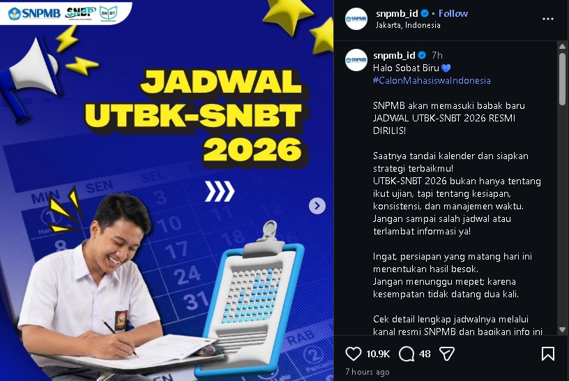 “UTBK-SNBT 2026 bukan hanya tentang ikut ujian, tapi tentang kesiapan, konsistensi, dan manajemen waktu. Jangan sampai salah jadwal atau terlambat informasi ya!” tulis akun tersebut.