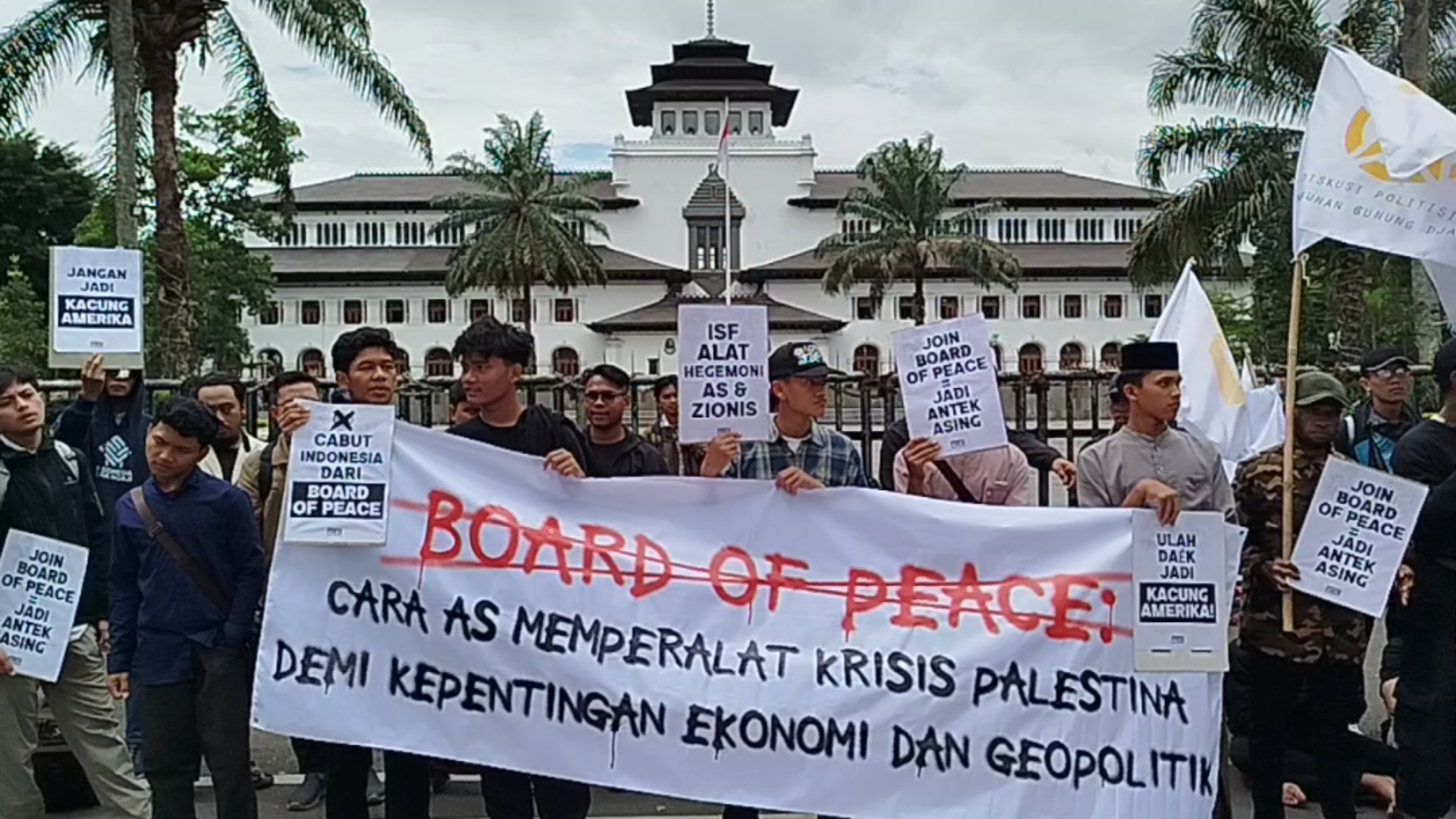 Dalam aksinya, puluhan peserta membentangkan spanduk bertuliskan penolakan terhadap keikutsertaan Indonesia dalam Board of Peace. Mereka juga menyuarakan kekhawatiran atas kemungkinan pengerahan militer Indonesia yang, menurut mereka, berpotensi berada di bawah komando langsung Amerika Serikat.
