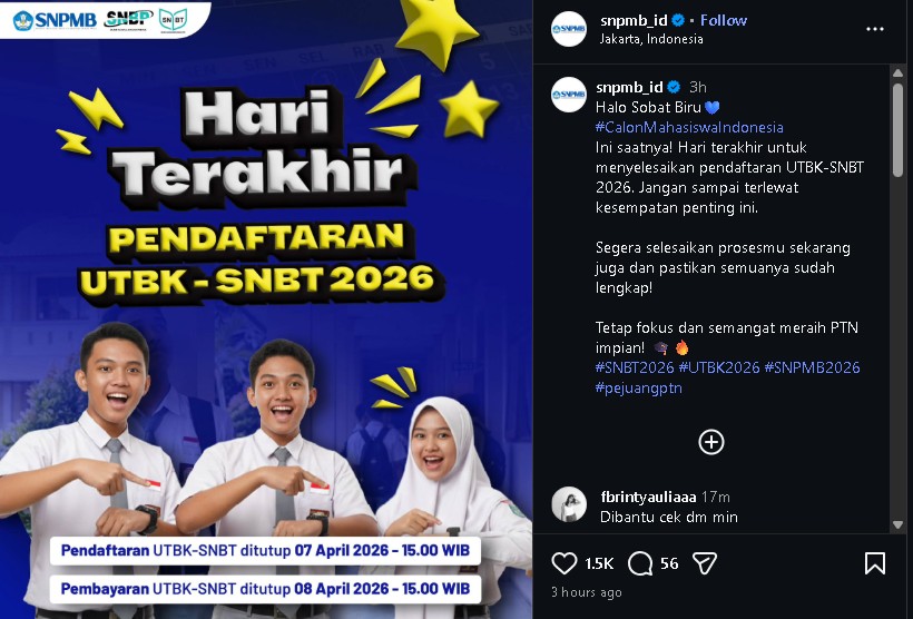 “Ini saatnya! Hari terakhir untuk menyelesaikan pendaftaran UTBK-SNBT 2026. Jangan sampai terlewat kesempatan penting ini,” tulis keterangan resmi tersebut.