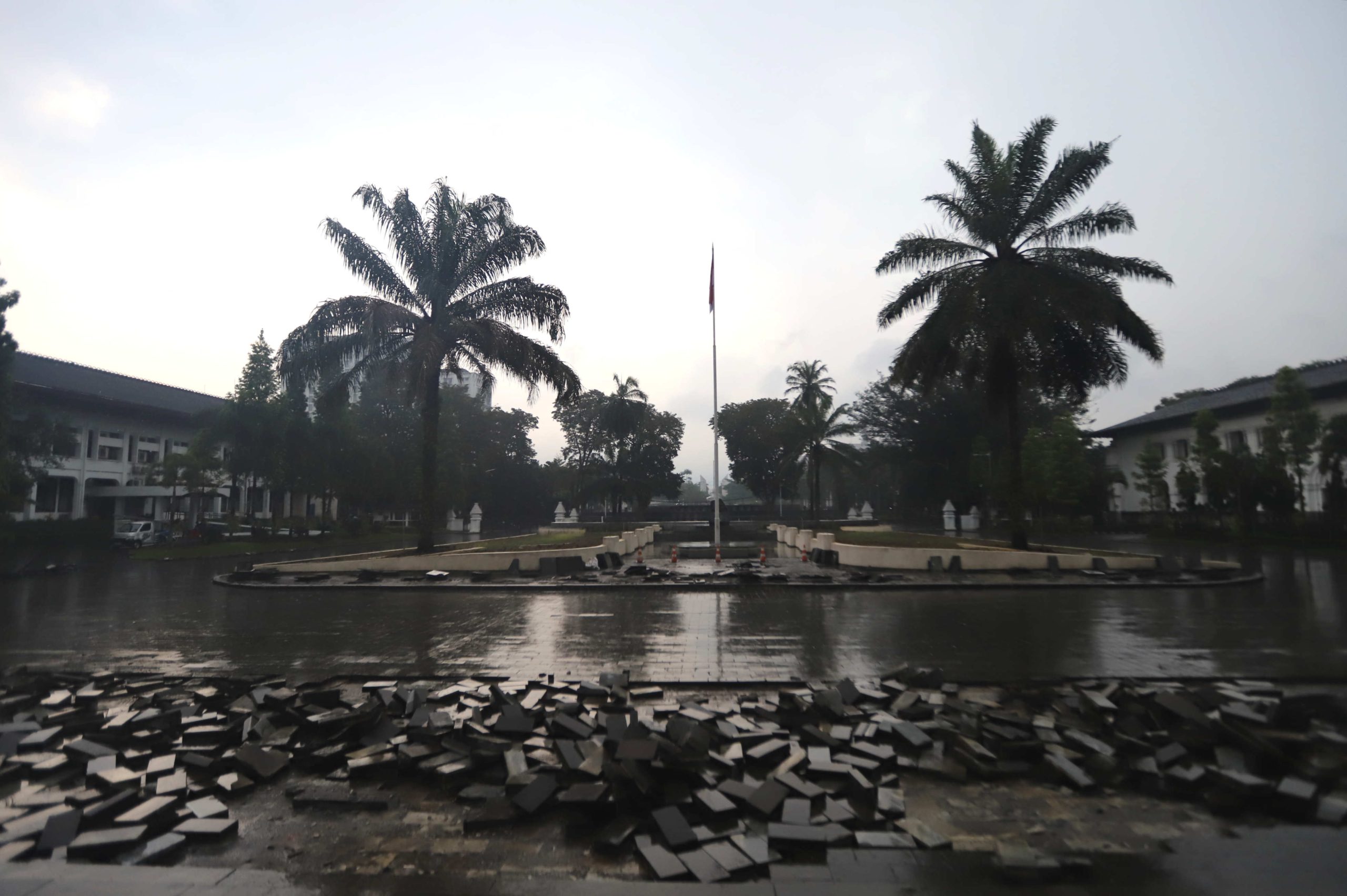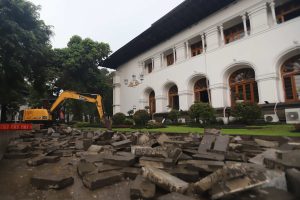 Tak hanya itu, taman yang sebelumnya dipenuhi berbagai tanaman hias di kawasan plaza turut dibongkar, hanya menyisakan lahan terbuka yang tengah dipersiapkan untuk penataan ulang.