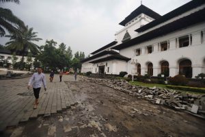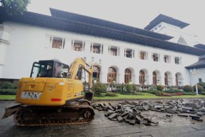 Setelah selesai dengan penataan gapura dan area parkir belakang, kini pembenahan difokuskan pada Plaza A di bagian depan Kantor Gubernur Jawa Barat.