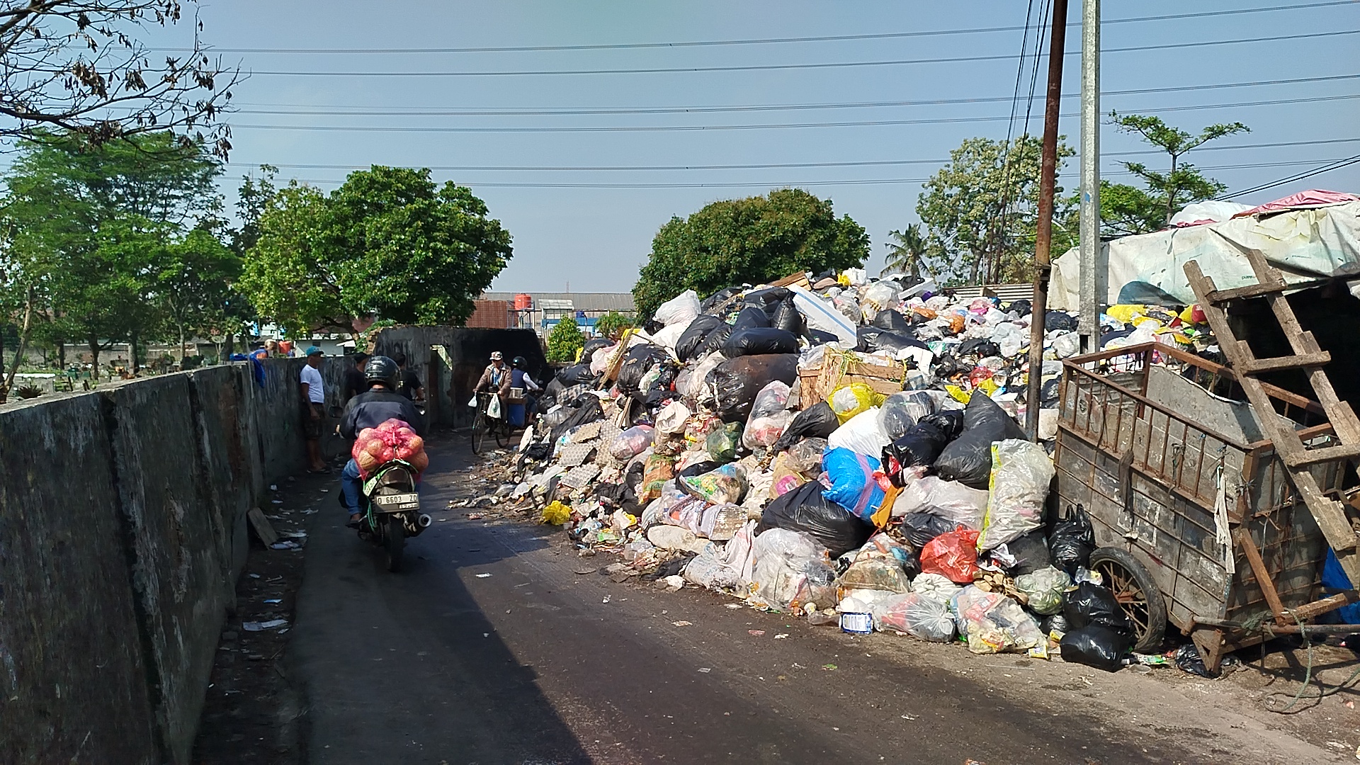 Sepanjang kurang lebih 100 meter, sampah menutupi hingga setengah badan jalan. Akibatnya, kendaraan yang melintas harus bergantian, sehingga arus lalu lintas menjadi tersendat.