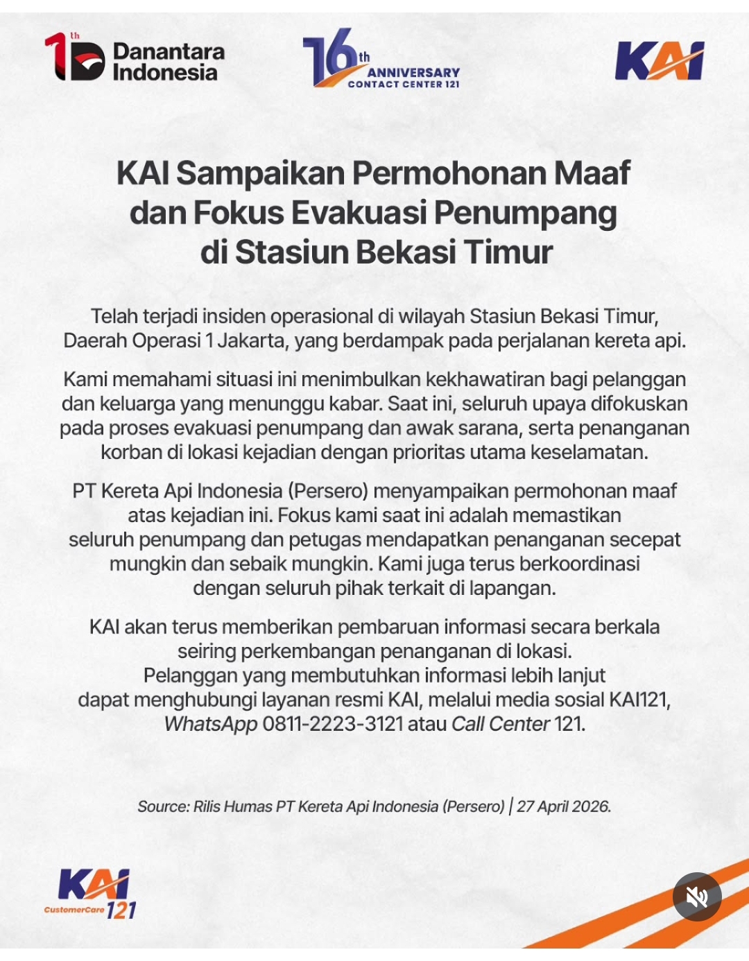 KAI menegaskan bahwa fokus utama saat ini adalah proses evakuasi penumpang dan awak sarana, serta penanganan korban di lokasi kejadian dengan mengutamakan keselamatan.