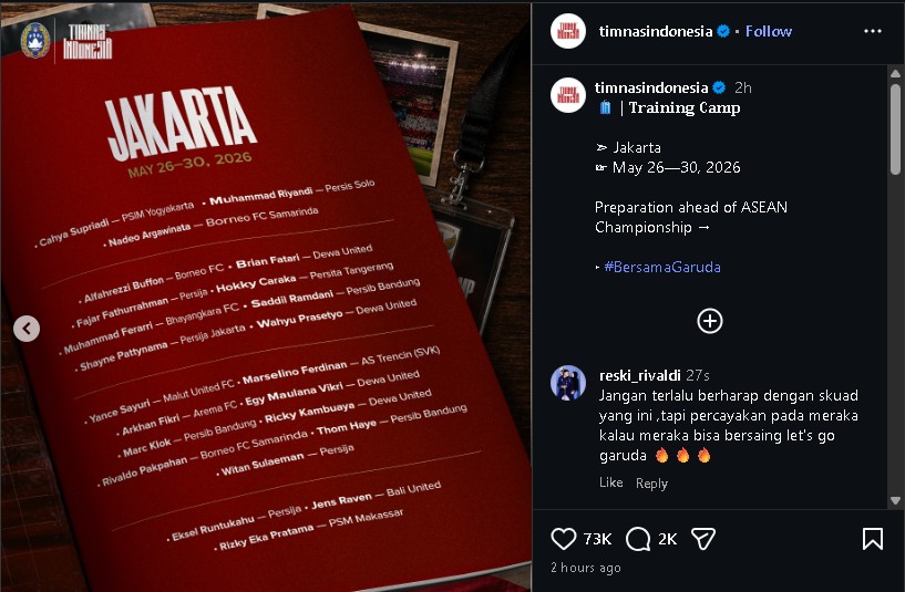 Namun, ada beberapa nama yang absen dan cukup menyita perhatian, seperti Eliano Reijnders dan Sandy Walsh yang sebelumnya tampil di FIFA Series 2026. Selain itu, pemain seperti Beckham Putra, Rizky Ridho, hingga Ivar Jenner juga tidak masuk dalam daftar kali ini.