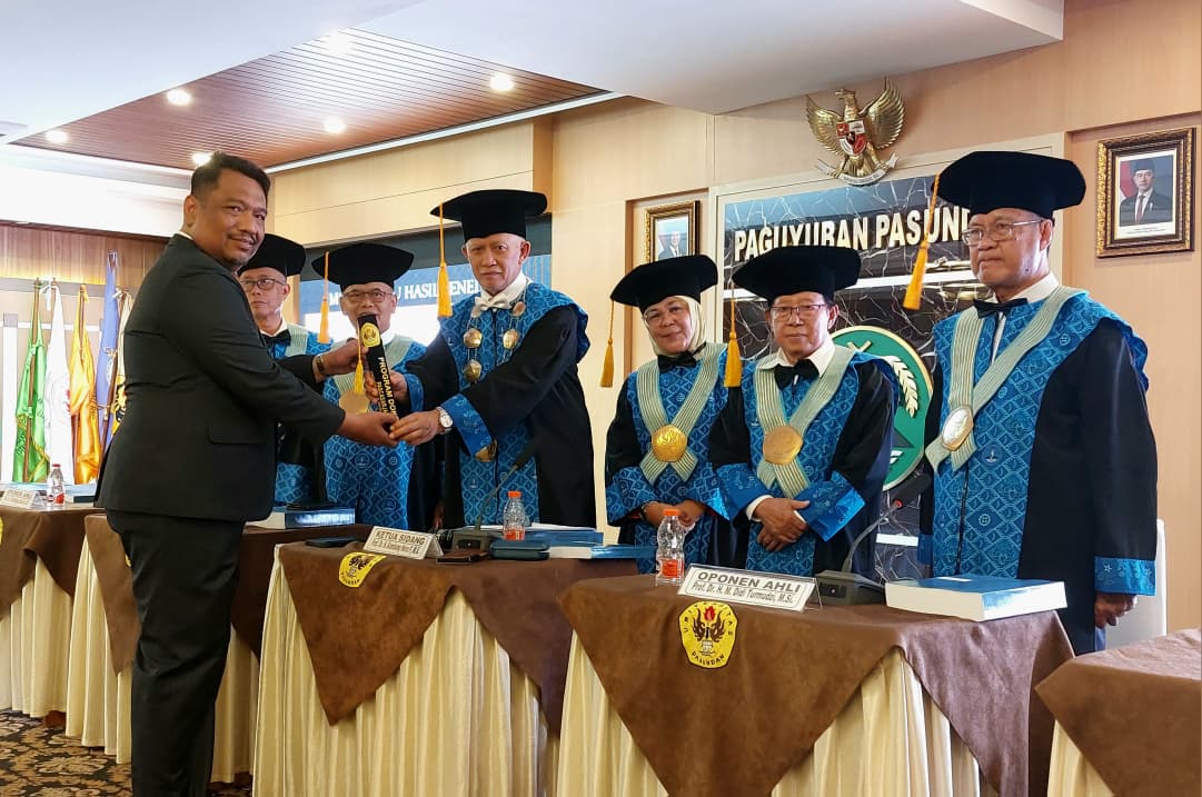 Sidang promosi tersebut dipimpin oleh Prof. Dr. H. Bambang Heru P, M.S., dengan promotor Prof. Dr. H. Kamal Alamsyah, M.Si., serta co-promotor Prof. Dr. Lia Muliawaty, M.Si.
