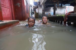 Pantauan di lokasi menunjukkan sejumlah anak terlihat bermain air di tengah genangan, sementara sebagian warga mulai mengevakuasi barang berharga ke tempat aman.