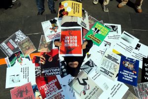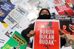 Peserta aksi membawa poster dan spanduk berisi tuntutan serta orasi-orasi terkait isu ketenagakerjaan, kebebasan sipil, dan keadilan sosial. (eci)